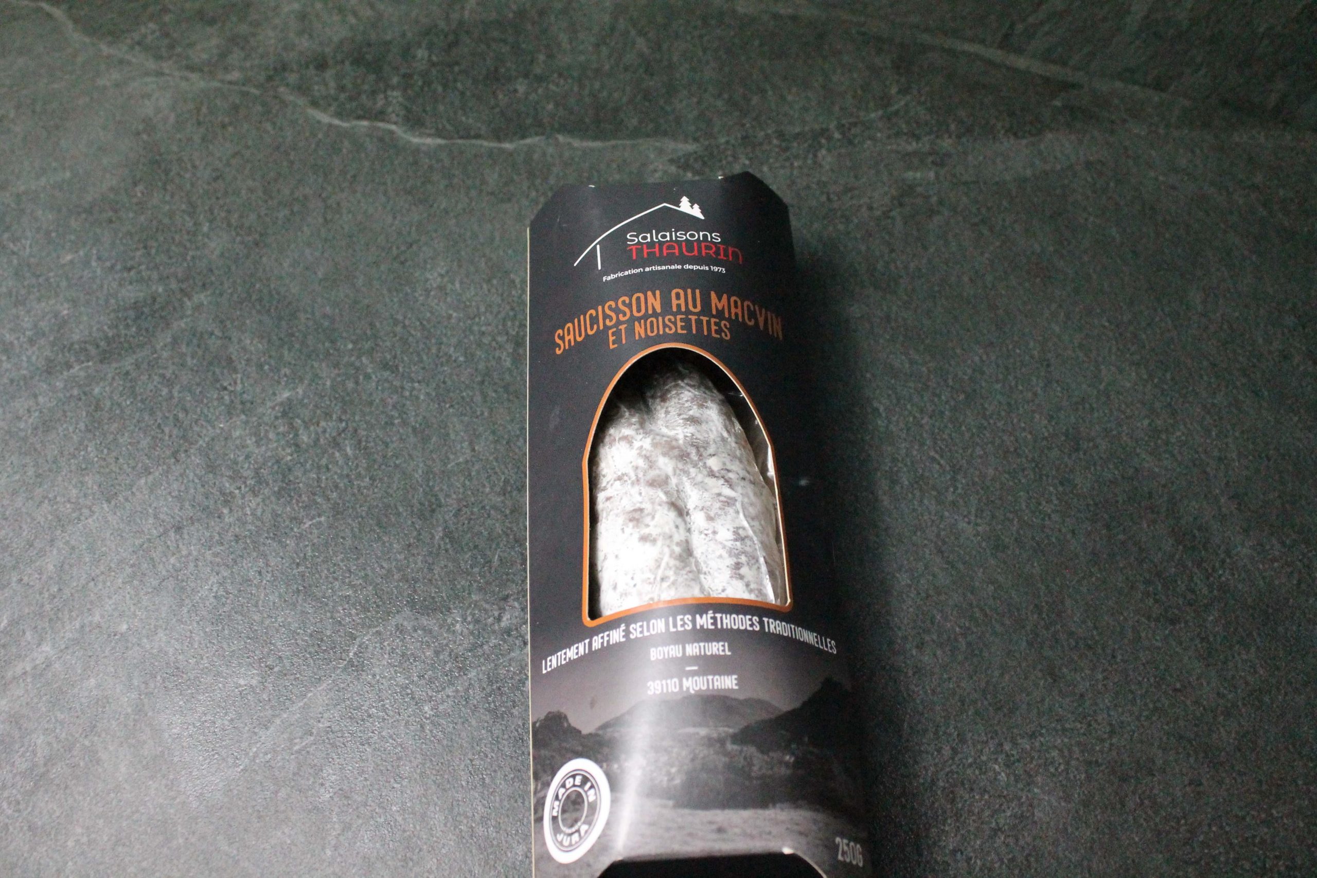Saucisson Macvin Noisettes fabrication artisanale de la maison “Fumé du Jura”. Vendu par pièces de 250g