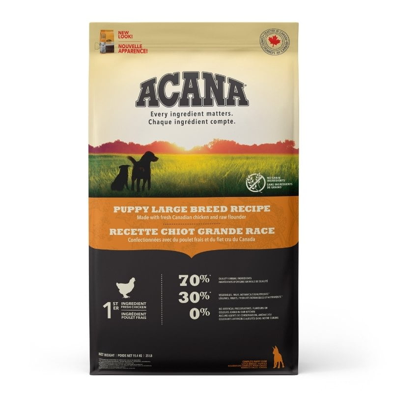 Dans les nourritures ACANA pour chiens, chaque ingrédient compte. Notre recette Chiot Grande race est formulée avec soin pour nourrir les chiots en croissance de toutes races. Cette riche recette, composée de 70%1 d’ingrédients d’origine animale de qualité comme du poulet frais et du flet cru du Canada équilibrés avec 30% de fruits, de légumes et de produits botaniques, offre à votre chiot les protéines et la nutrition dont il a besoin pour favoriser son développement rapide. Notre recette ACANA Chiot Grande race équilibrée est composée d’ingrédients d’origine animale de qualité, de fruits, de légumes et de produits botaniques qui nous sont livrés quotidiennement, pour que votre chien se régale de repas toujours dignes du marché fermier.