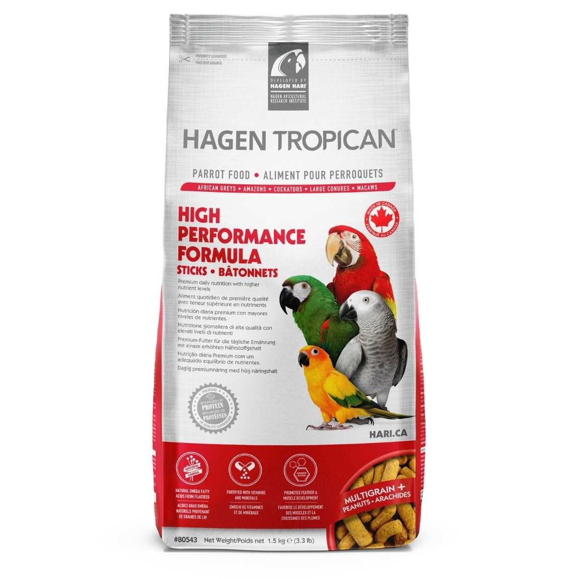 La formulation de bâtonnets Haute Performance Tropican pour perroquets est conçue scientifiquement et constitue une alimentation entièrement équilibrée qui satisfait les besoins des oiseaux en période de reproduction (ponte d’œufs et élevage des bébés) ainsi que des perroquets en croissance (nourrissage à la main de la couvée).