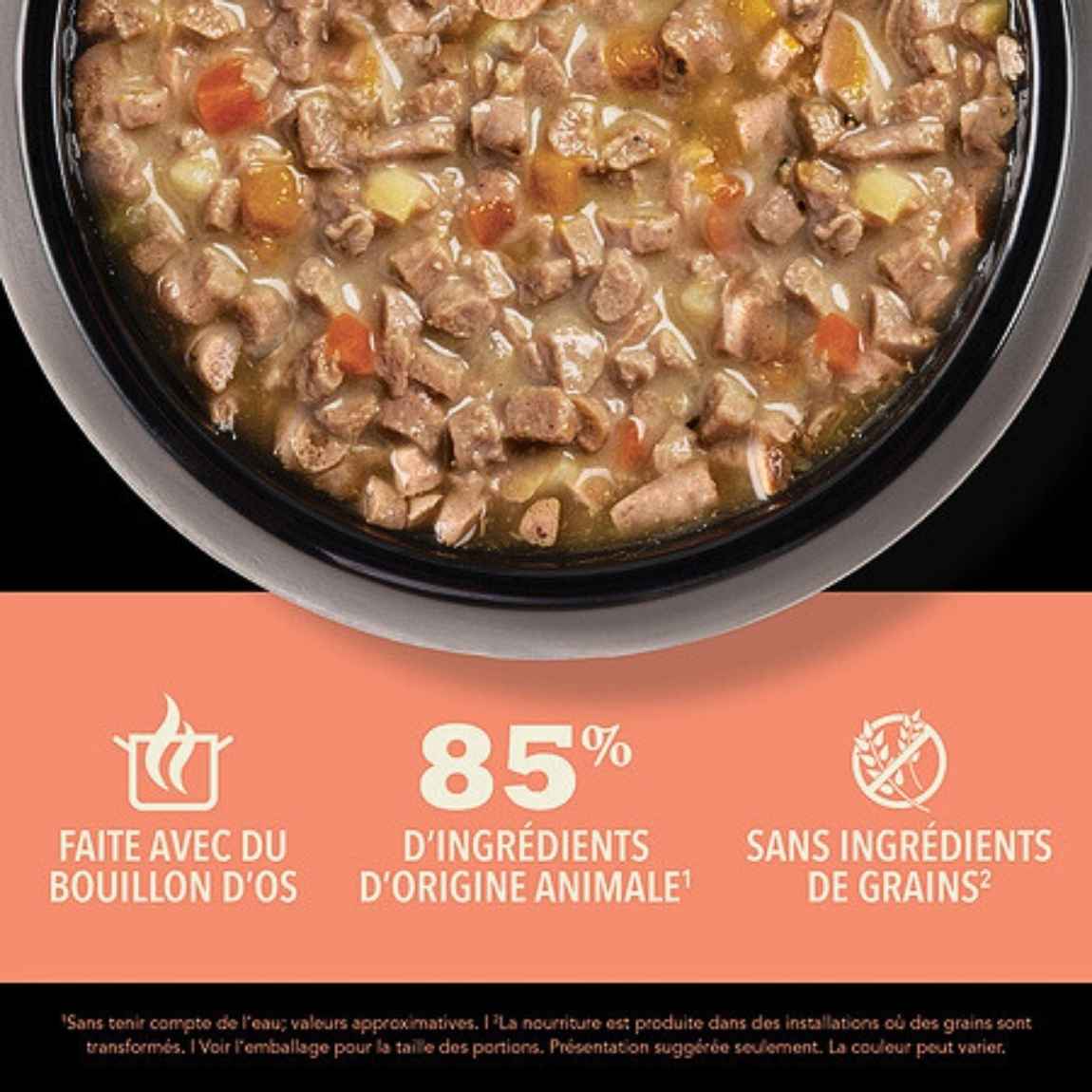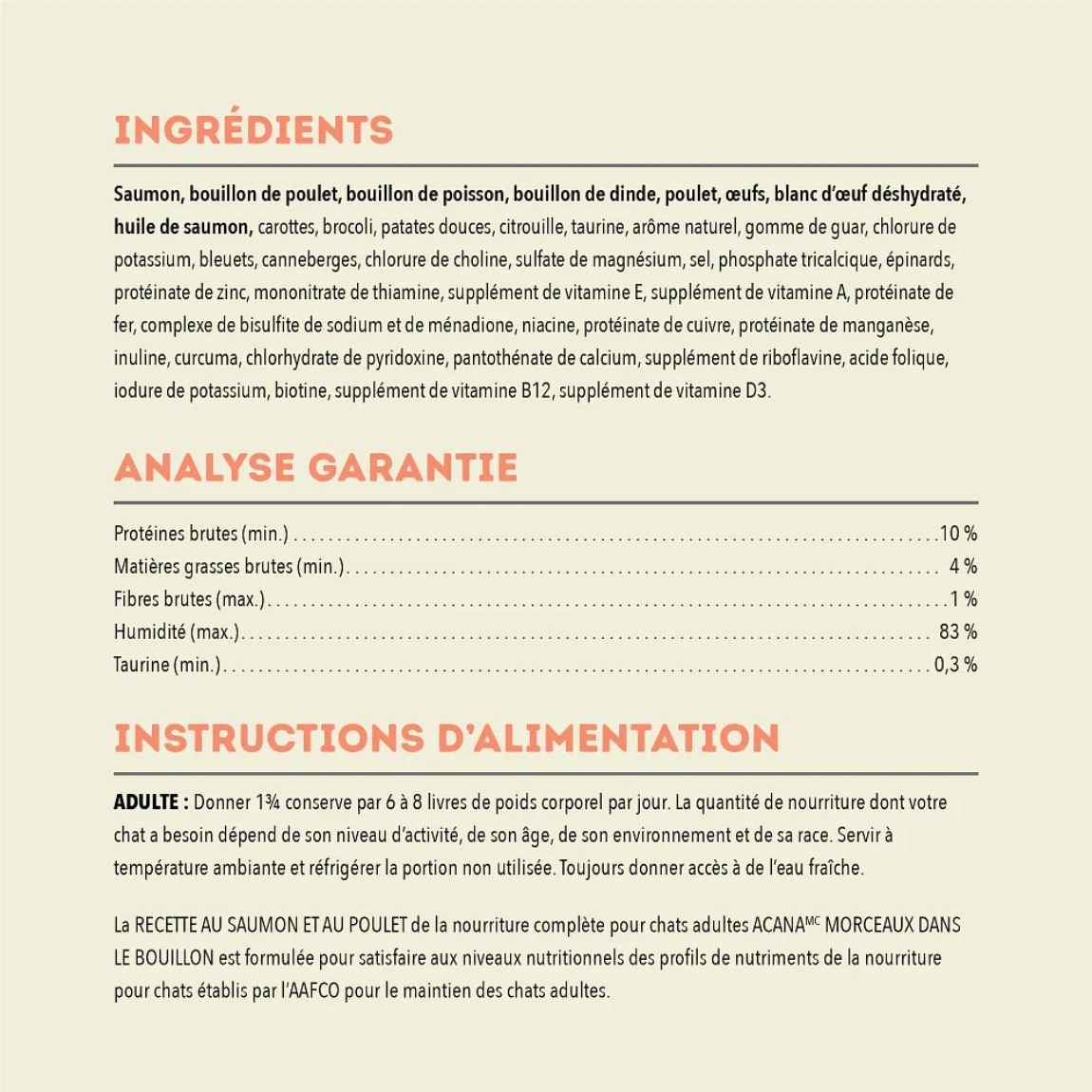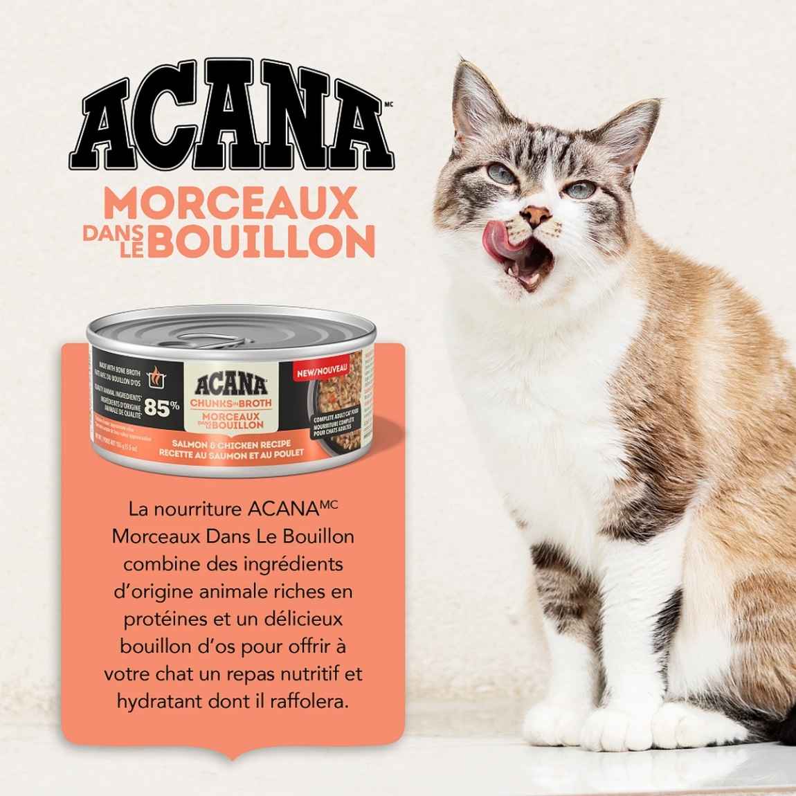 Nourrissez votre chat avec les ingrédients d’origine animale riches en protéines et le délicieux bouillon d’os de la nourriture humide pour chats ACANA Morceaux dans le bouillon! Faite à 85 % d’ingrédients d’origine animale, notre recette au saumon et au poulet fournit à votre chat les protéines animales nourrissantes dont il a besoin. Chaque conserve contient des ingrédients d’origine animale nourrissants, comme du saumon et du poulet savoureux servis sous la forme de morceaux copieux. Elle contient également du bouillon de poisson, de poulet et de dinde hydratant pour titiller les papilles de votre chat et lui apporter l’hydratation dont il a besoin. Cette recette contribue également à la santé immunitaire de votre chat ainsi qu’à la santé de sa peau et de son pelage. Servez à votre chat une nourriture humide qui l’aidera à se sentir si bien à l’intérieur que cela se verra à l’extérieur!