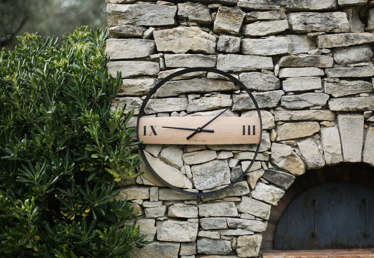 Horloge épurée : conçue à partir d’une douelle de barrique et du cerclage le plus petit d’une même barrique.